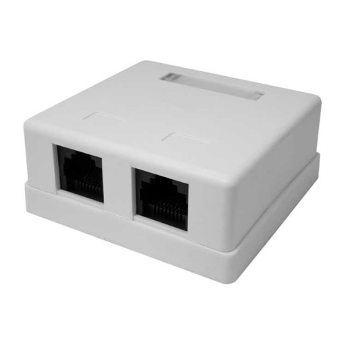 Неэкранированная компьютерная розетка настенного монтажа. Соответствует характеристикам категории 5е. Имеет 2 порта RJ-45 (8р8с).